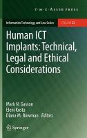 Human information and communication technology (ICT) implants have developed for many years in a medical context. Such applications have become increasingly advanced, in some cases modifying fundamental brain function. Today, comparatively low-tech implants are being increasingly employed in non-therapeutic contexts, with applications ranging from the use of ICT implants for VIP entry into nightclubs, automated payments for goods, access to secure facilities and for those with a high risk of being kidnapped. Commercialisation and growing potential of human ICT implants have generated debate over the ethical, legal and social aspects of the technology, its products and application. Despite stakeholders calling for greater policy and legal certainty within this area, gaps have already begun to emerge between the commercial reality of human ICT implants and the current legal frameworks designed to regulate these products. This book focuses on the latest technological developments and onthe legal, social and ethical implications of the use and further application of these technologies.