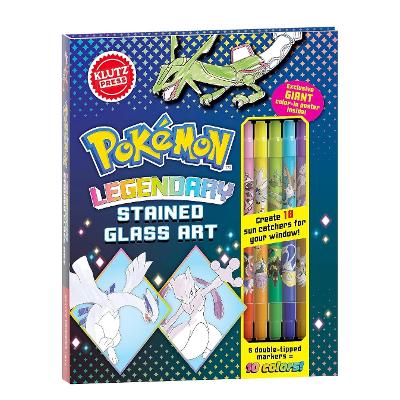 Special vellum paper lets you colour in 18 pieces of Legendary Pokémon art that look like stained glass. Use the included double-tipped markers in 10 custom colours. Then hang your artwork in a window and watch it light up!