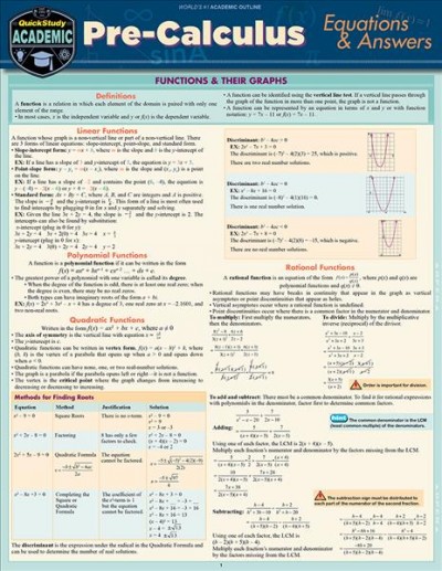 Each step higher in math studies is crucial to doing well at the next level. Support for this gateway course to Calculus is needed among most people heading through that gate to successful careers in science, engineering, computers and economics. Our math authors at ExpoLog who also write math textbooks take great care to cover the core of what students need to know to succeed. Expertly authored and designed, this powerful and amazingly affordable 6 page laminated guide offers clear and concise examples, explanations, and the graphs that go with them. QuickStudy math guides have helped many students push through a difficult course and have helped others shine even brighter. Great for exam reviews, regular weekly study or reference in class.